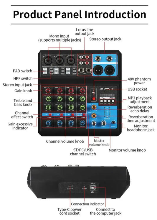 5 Channel Sound Mixer Table Audio Professional Portable Digital Console Computer Recording DJ Controller Processor USB Bluetooth