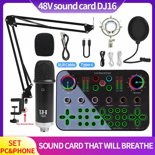 48V DJ16 Sound Card BM 800 Microphone Bluetooth Wireless Karaoke with Live Streaming for PC Phone Singing Games Youtube TikTok