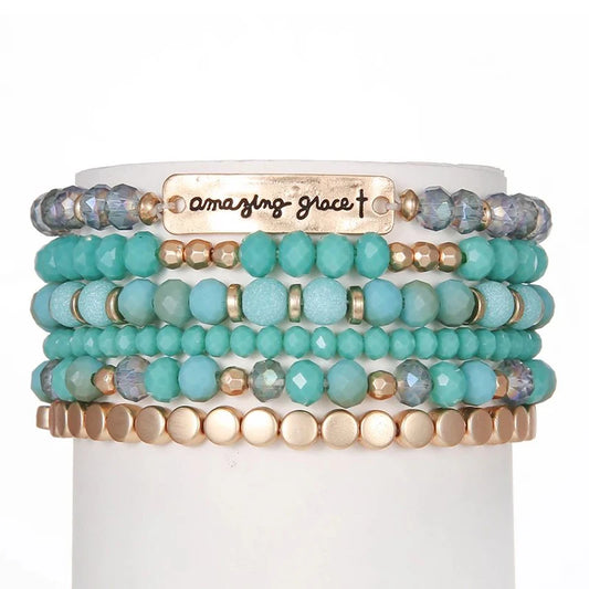 6 Pcs Set Turquoise Glass Beads Elastic Bracelet Faceted Acrylic Gold Color Square Matel Beads ID With Greeting Letters Bracelet
