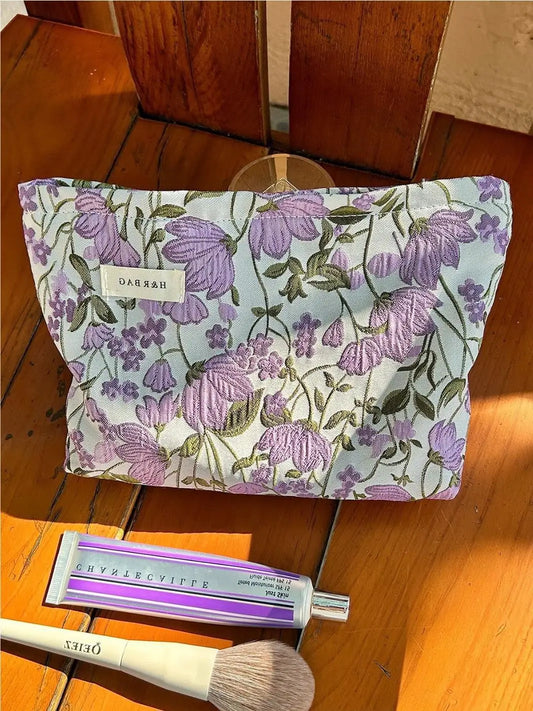 A Girl Holding a Taro Flower Colored Woven Makeup Bag, Students Traveling, Toiletries, Storage Bags, Canvas Bags