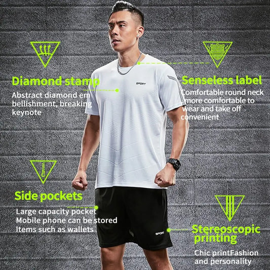 Fitness Clothes Mens Ice Silk Quick Drying Sportswear Set Summer Short Sleeved Tshirt Morning Running Basketball Training Room