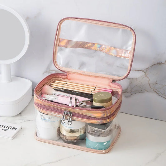 Large Capacity Women's Portable Travel Toiletry Bag Double Layer Transparent Handheld Makeup Storage Bag Waterproof PVC Square S