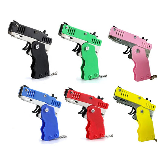 Venta al por mayor de mini pistolas de goma para disparar, material de aleación, llavero multifunción de 6 colores, plegables, divertidas minipistolas de juguete para niños