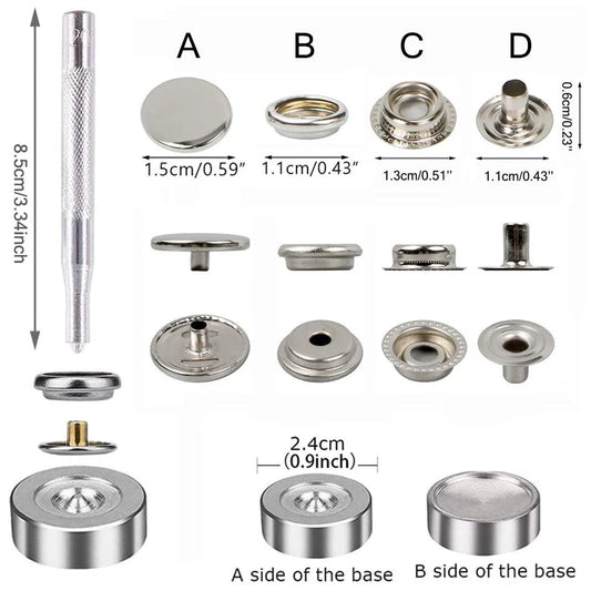 Juego de 60 hebillas cuatro en uno de acero inoxidable, hebillas de 15 mm, adecuadas para cubiertas de barcos, costura de cuero, lona, jeans, chaquetas