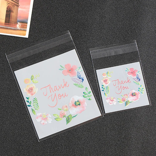 100 piezas/lote de bolsas de plástico autoadhesivas con forma de flor de agradecimiento para galletas caseras, regalos de fiesta, bolsas de embalaje de joyería DIY