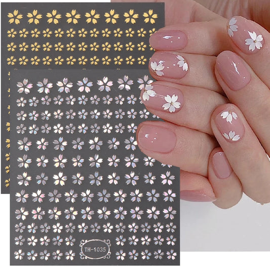 Pegatinas 3D para uñas con diseño de flor de cerezo y láser, láminas holográficas, pegatinas deslizantes adhesivas con forma de serpiente, estrella y corazón, para manicura con flor de cerezo