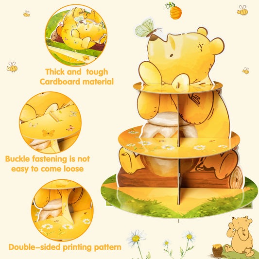 Soporte para cupcakes con forma de oso de miel de 3 capas, bonito soporte para tartas con forma de oso de miel amarillo de cartón para baby shower, fiesta de cumpleaños, actividad para niños