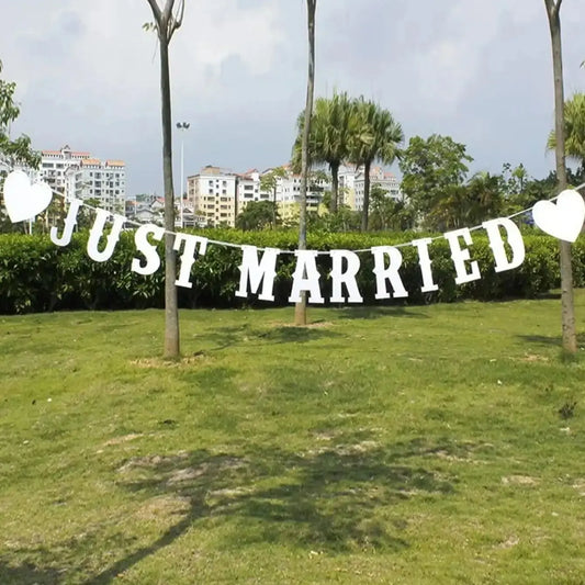 Bandera blanca con texto en inglés "Just Married Love", bandera con flores para colgar, bandera con flores para colgar en la fiesta de bodas, accesorios para fotografía de bodas