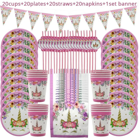 Juego de vajilla desechable para fiesta de unicornio, decoración para fiesta de cumpleaños de niña, platos, vasos, pancarta, regalo para baby shower