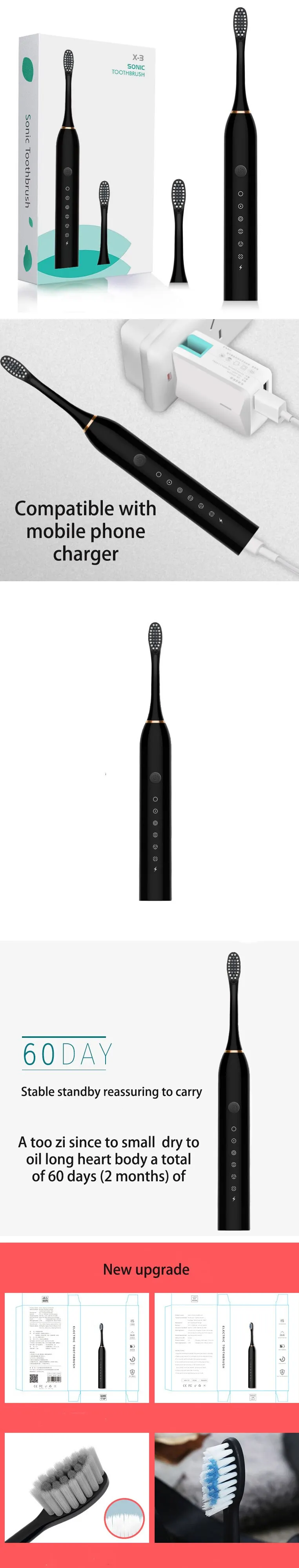 • Recargable por USB: el cepillo de dientes es recargable por USB, lo que hace que sea conveniente cargarlo y usarlo en cualquier momento y en cualquier lugar.