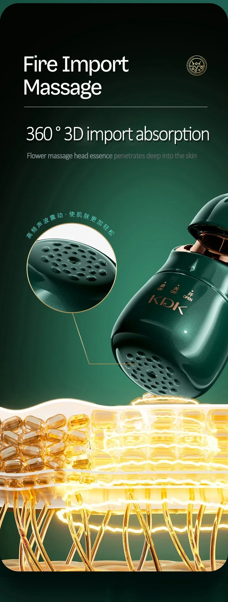 • Principio de masaje por vibración: El principio de masaje por vibración de este dispositivo ayuda a la circulación sanguínea, promoviendo la salud y la vitalidad de la piel.