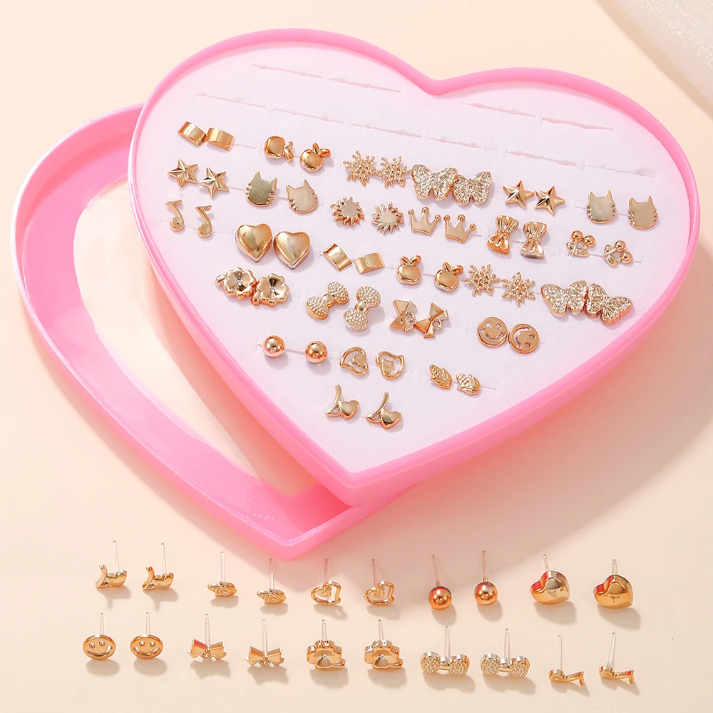 Nuevo diseño aleatorio, 36 pares/lote, adorables mini pendientes con forma de copos de nieve, gato, mariposa, pendientes para niña, joyería de moda para uso diario
