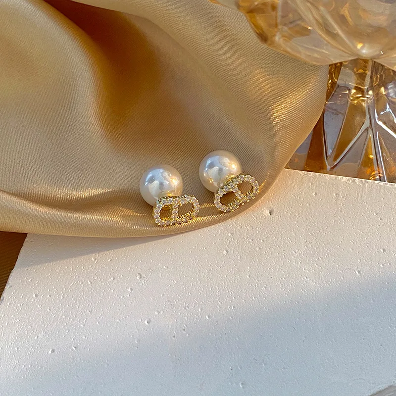 Nuevos y elegantes pendientes de aguja de alta gama con sensación ligera y de lujo para mujer, pendientes de perlas con letras francesas y microdiamantes de imitación