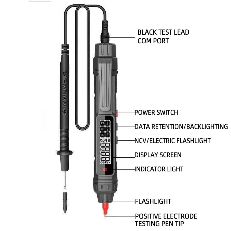 Function: Intelligent measuring pen, live wire discrimination, on/off buzzing, automatic measurement, over range indication, low voltage indication, flashlight, automatic shutdown, data retention