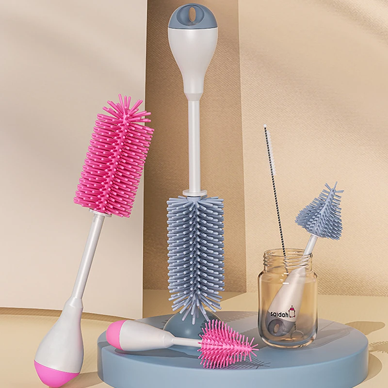 360 Degree Rotation 3 In 1 Silicone Baby Bottle Pacifier Brush Wash Water Cup Container Straw Cleaning Brush Set