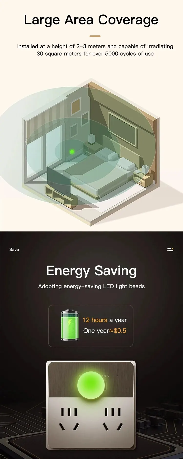 Safe and Harmless Mosquito Repellent Method: This LED mosquito repellent night light utilizes physical mosquito repellency principles without any chemical components or harmful substances, making it particularly friendly to infants, toddlers, and pregnant women, ensuring health and safety during use.