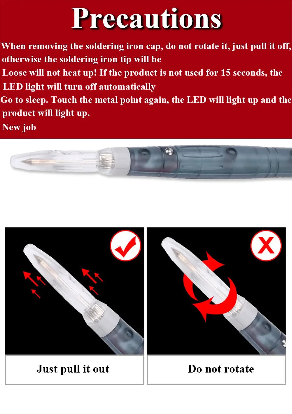 otherwise the soldering iron tip will be Loose will not heat up! If the product is not used for 15 seconds, the LED light will turn off automatically Go to sleep. Touch the metal point again, the LED will light up and the product will light up New job