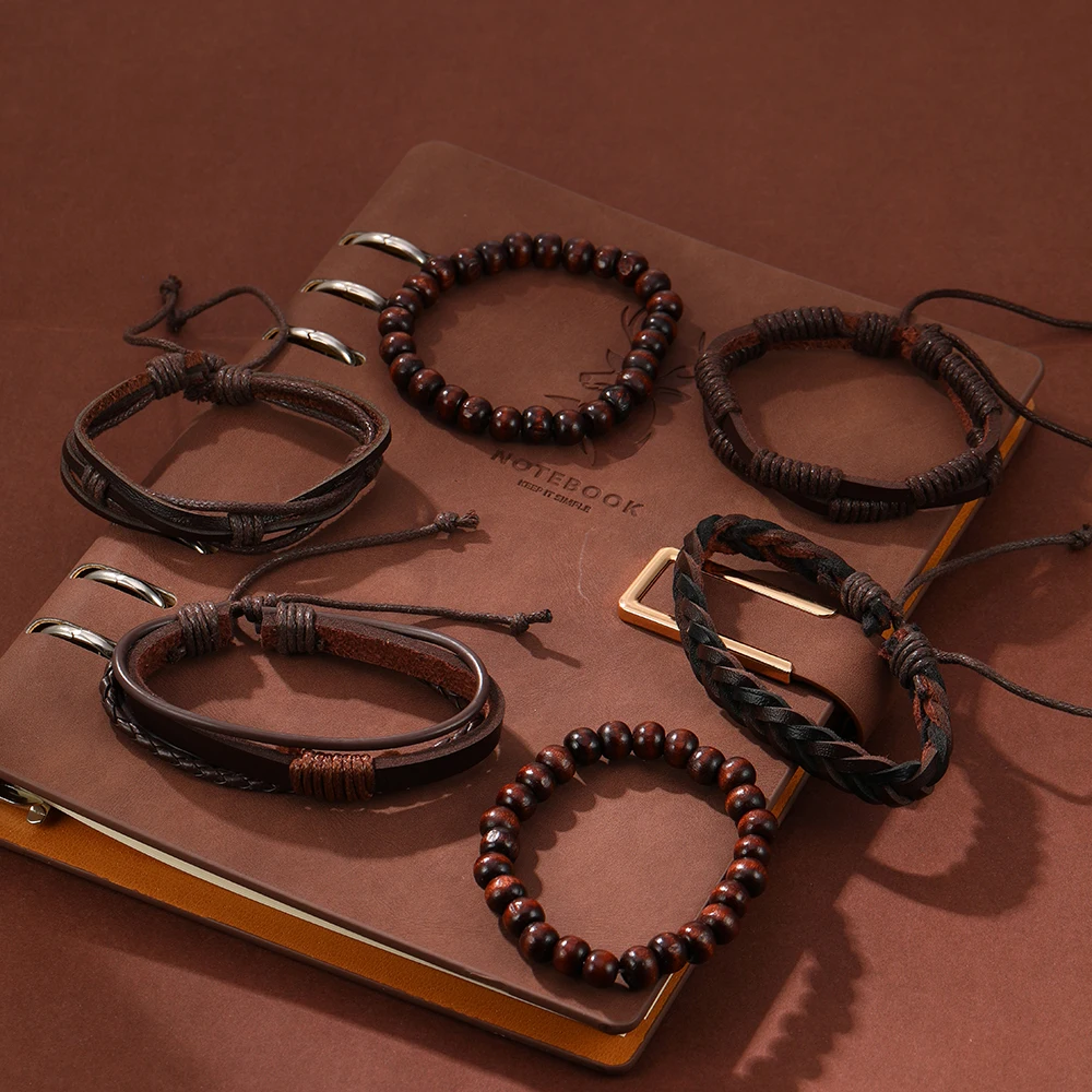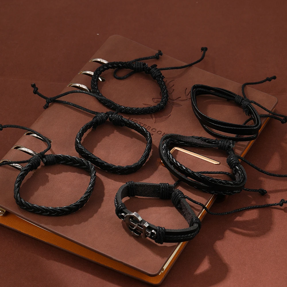 6PCS Set Men's Vintage Braided Cowhide Bracelet Multi-layer Leather Bracelet