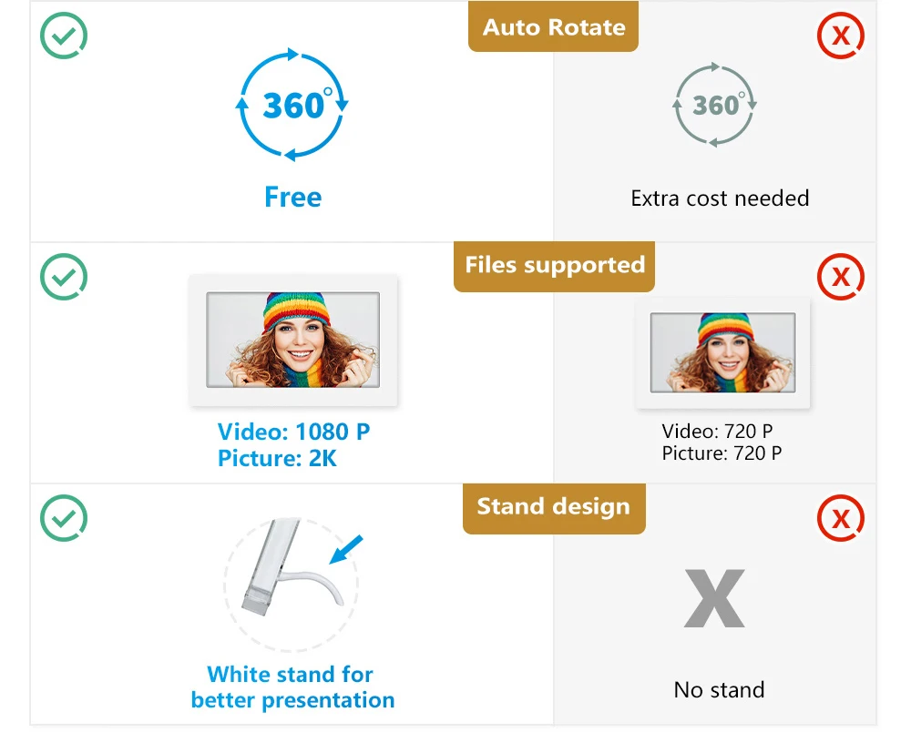 Unique & Exquisite Design: The sophisticated acrylic motion video frame gets rid of the traditional plastic-looking housing. The new and unique acrylic digital photo frame perfectly presents the true color of pictures and videos.The current 7-inch picture frame digital slideshow screen only supports vertical display, which is a beautiful decoration for any corner of your home