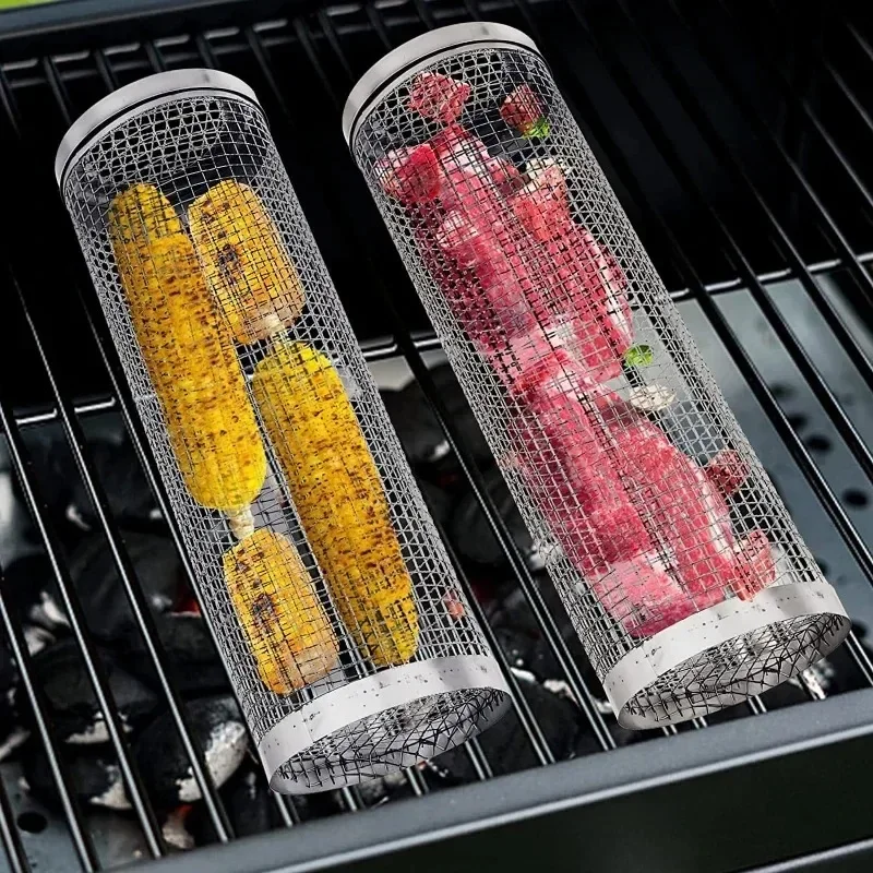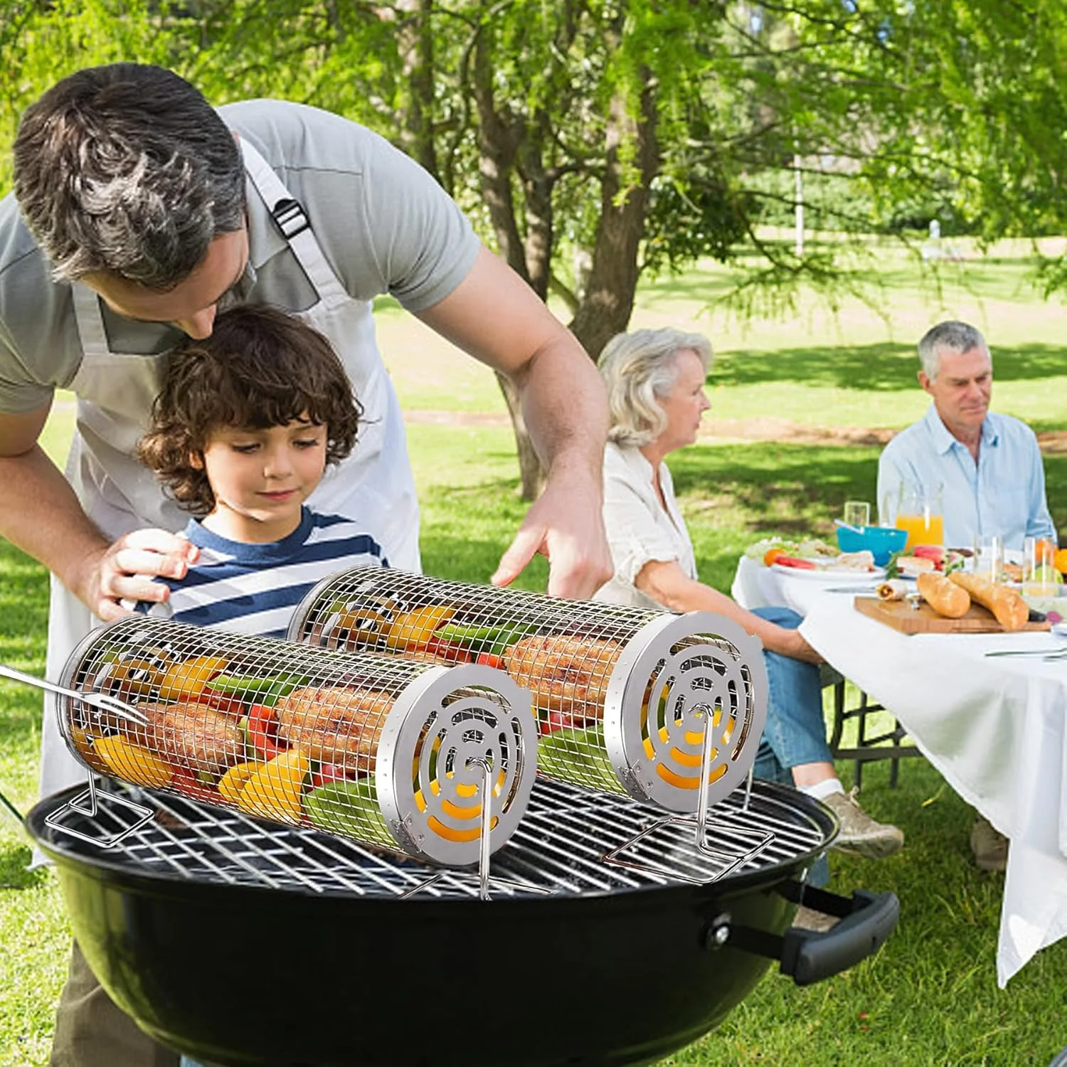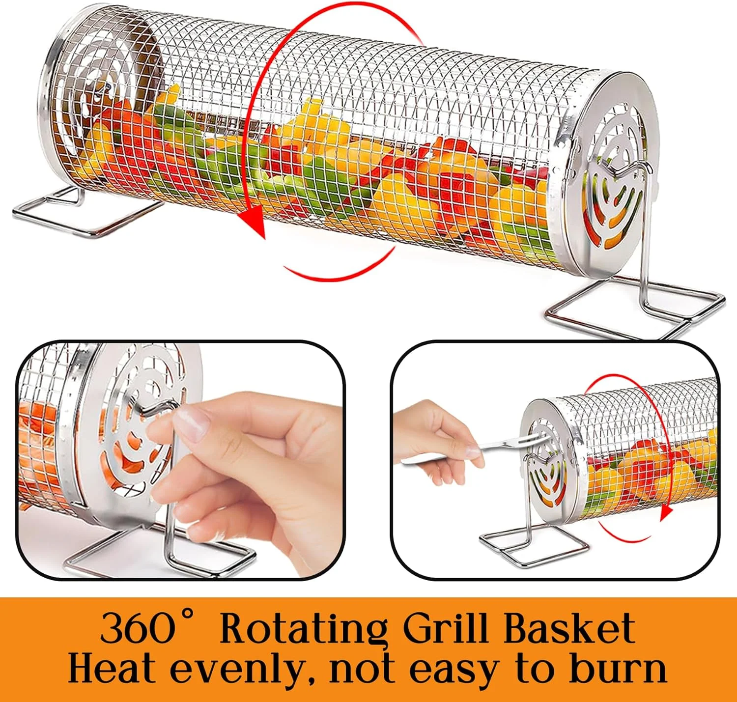 BBQ Grill Basket, Rolling Grilling Basket, Stainless Steel Grill Mesh Barbeque Grill Accessories forOutdoorOutdoor rolling grill