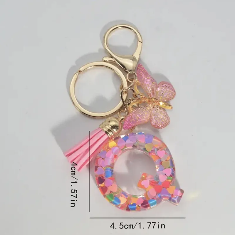 Fashionable new resin keychain, pink glitter, dropper, English letter keychain pendant, butterfly tassel accessory, holiday keychain gift