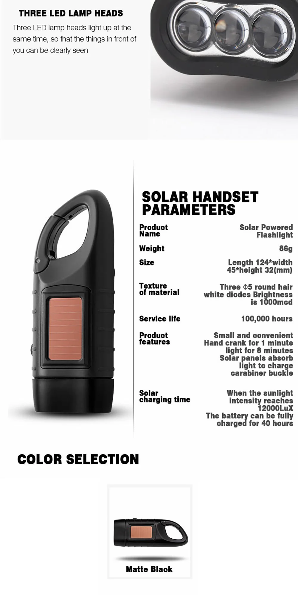 1. Solar: A flashlight with solar and hand-crank charging. With the built-in battery, you can save energy for a long time without an external battery.