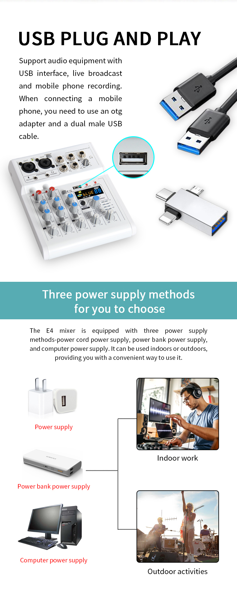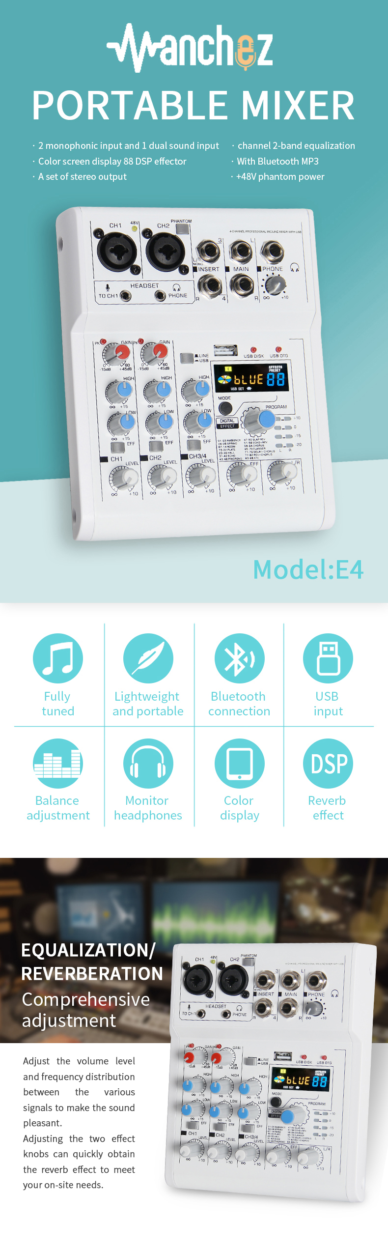 Elevate your audio production and mixing capabilities with the Manchez E4 E7 Mini 4 6 A4 A6 Channel Sound Card Mixer. This versatile USB console is designed for DJs, karaoke enthusiasts, and professional audio recording, making it the perfect addition to any setup for smartphones, computers, and professional recording equipment.