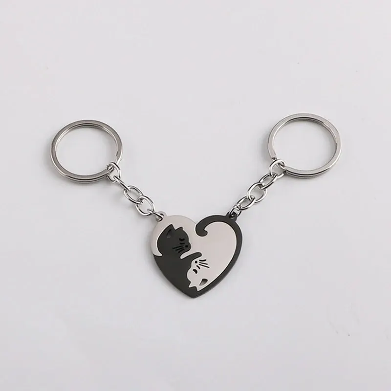 Small Item Portable Stainless Steel Keychain Heart-shaped Splicing Cat Yin and Yang Cat Pendant Necklace Keychain Jewelry