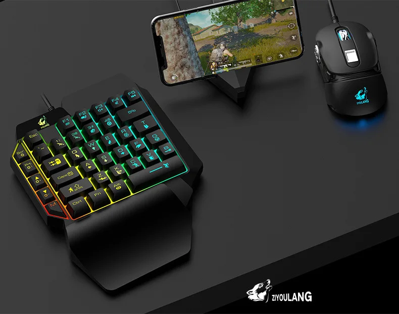 T1 One Hand Mobile Phone Game Keyboard and Mouse Set Converter Mini Wired Gaming Keyboard Mouse with RGB Light for Android IOS