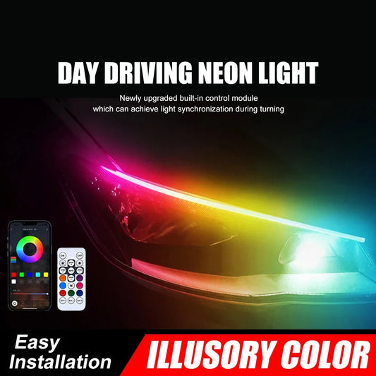 Um par de luzes diurnas de ilusão RGB para carro, aplicativo móvel, controle Bluetooth, faixa de luz de 30 cm, 45 cm, 60 cm, faixa de lâmpada de direção