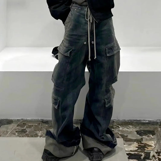 RO Style Gradient Ribbons Multi-bolsos Cordão Jeans para Homens Harajuku Streetwear Baggy Y2K Denim Calças Cargos Oversized