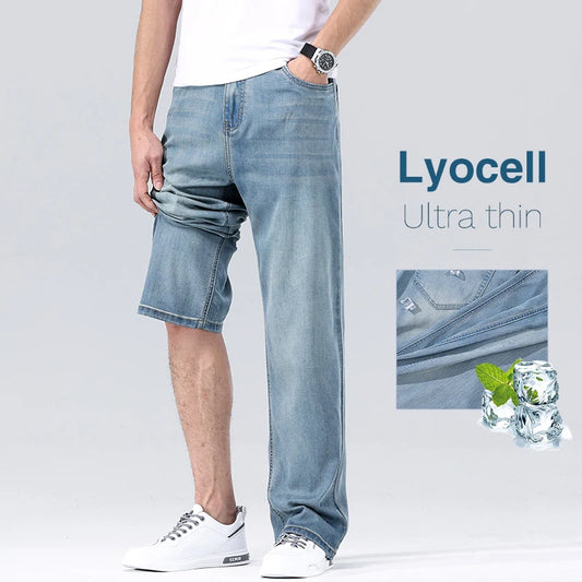 Calça Jeans Solta Ultra Fina Lyocell Masculina Moda Verão Drape Tecido Macio Negócios Calça Jeans Reta Pernas Largas Calças De Seda Gelo
