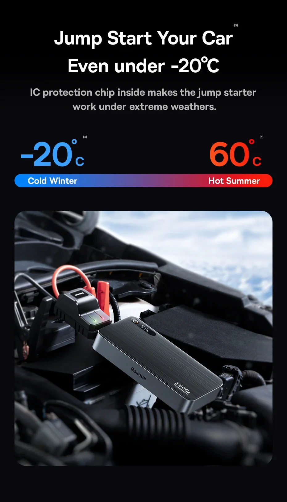 O chip de proteção IC interno faz com que o jump starter funcione em condições climáticas extremas.