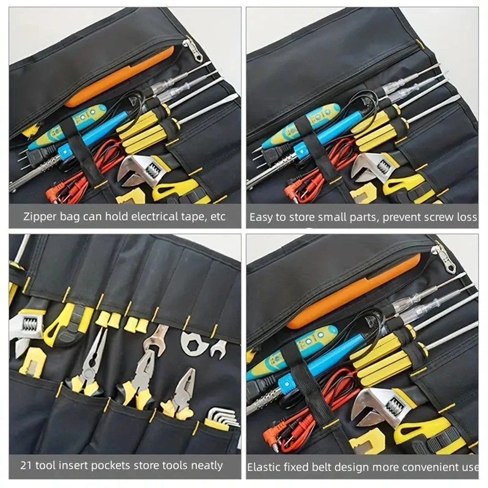 【LARGE CAPACITY & MULTIPOCKETS】This roll up tool bag is use compact design, 22 open tool slots and elastic straps can securely hold most of your tools, such as wrenches, pliers, screwdrivers,etc; Attach with zipper pocket can hold a variety of small tools.