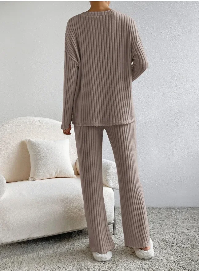 Fashionable Casual Women's Knitwear Set 2023 Autumn New Style Straight-leg Pants Loose-fit V-neck Ribbed Knit Coords