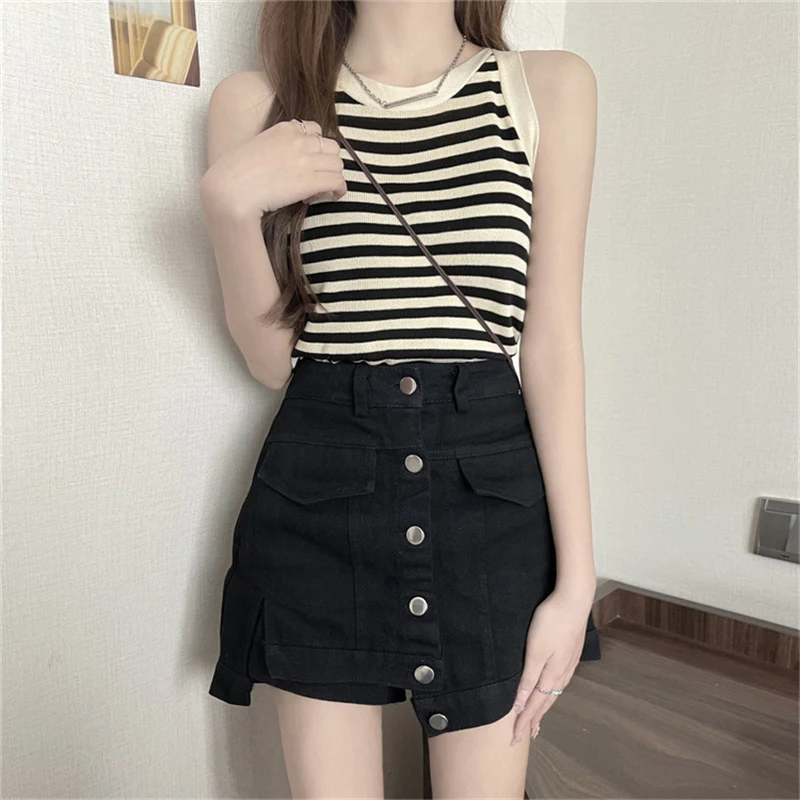 Verão Coreano Listra Malha Regata Mulheres Gola Redonda Sem Mangas Slim Camisola